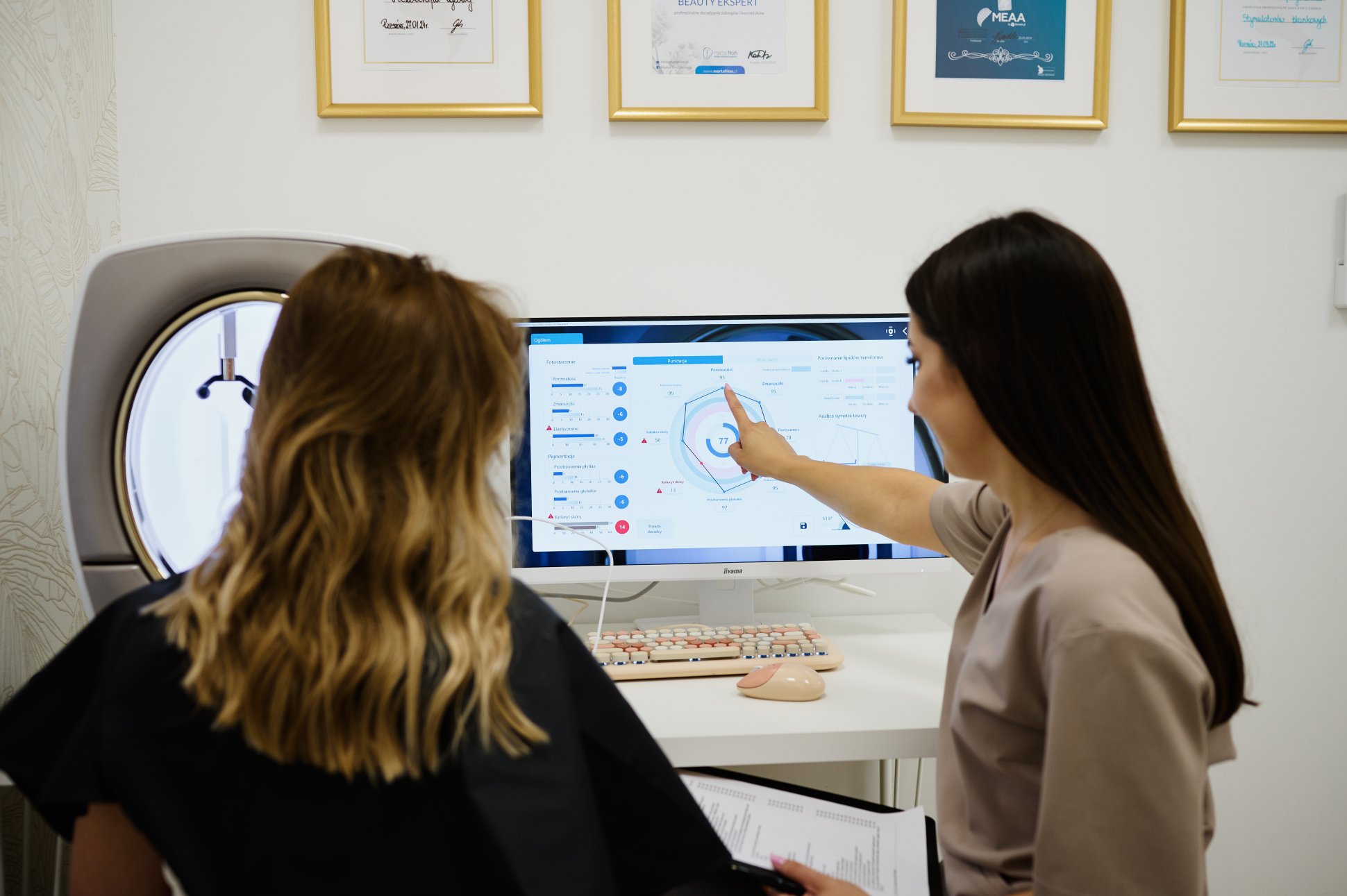 Komputerowa analiza dostarcza obiektywne dane o skórze. To nie tylko zdjęcia problemów, ale kompleksowa diagnostyka i ocena stanu cery.